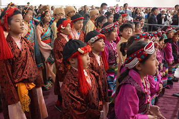 Young Tibetans in traditional dress listen to His Holiness the Dalai Lama during his meeting with the Tibetan community in Madison, Wisconsin on May 14, 2013. Photo/Jeremy Russell/OHHDL