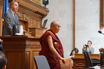 His Holiness the Dalai Lama is introduced during his visit to the Wisconsin State Legislature in Madison, Wisconsin on May 14, 2013. Photo/Jeremy Russell/OHHDL