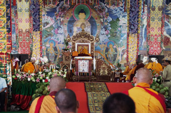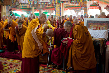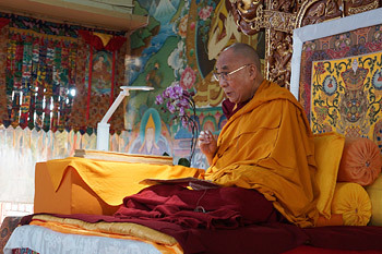His Holiness the Dalai Lama during the second day of his teachings at Sera Jey Monastery in Bylakuppe, Karnataka, India on December 26, 2013. Photo/Kate Surjok