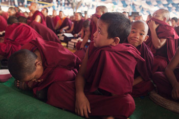 Some of the younger members of the audience attending His Holiness the Dalai Lama's teachings at Sera Jey Monastery in Bylakuppe, Karnataka, India on December 26, 2013.