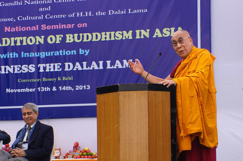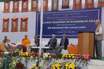 His Holiness the Dalai Lama addressing the inauguration of the two day national seminar on the Nalanda Tradition of Buddhism in Asia in New Delhi, India on November 13, 2013. Photo/Jeremy Russell/OHHDL