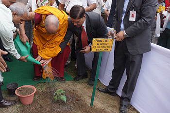 His Holiness the Dalai Lama planting a peepal sapling following the inaugural meeting of the two day national seminar on the Nalanda Tradition of Buddhism in Asia in New Delhi, India on November 13, 2013. Photo/Jeremy Russell/OHHDL