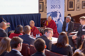 Since the Global Scholars Symposium is intent on initiating action, one student asked, what is the biggest challenge we face today? His Holiness mentioned the huge gap between the North and South, between rich and poor. In the North there is a surplus of food, while in the South there is starvation. This is a serious problem we have to address. Another enquiry concerned the continuing role of the academic world and His Holiness suggested the creation of materials to raise awareness, keeping in mind the need to foster inner values. One student wanted to know about how His Holiness deals with the responsibilities of begin Dalai Lama. He answered: