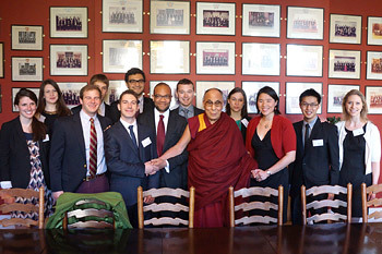 His Holiness the Dalai Lama meets with the twelve student organizers of the Global Scholars Symposium at the Cambridge Union in Cambridge, England, on April 20, 2013.