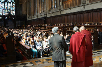His Holiness the Dalai Lama speaking on the Path to Peace and Happiness at St John's College Chapel in Cambridge, England, on April 20, 2013. Photo/Jeremy Russell/OHHDL