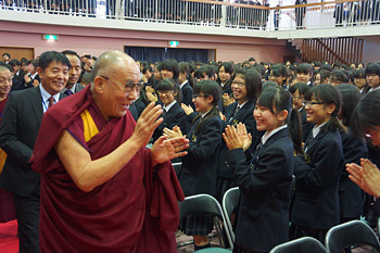 Tokyo, Japan, 18 November 2013 - When His Holiness the Dalai Lama stepped out of his car into the sunshine and the grounds of the Yakumo Academy this morning a great cheer went up. He was audibly welcomed not only by the students on the quadrangle, but also those on the balconies and at the windows of classrooms on the upper floors. Many of them waved Tibetan flags in their hands. He was greeted personally by the President-principal Akira Kondo.