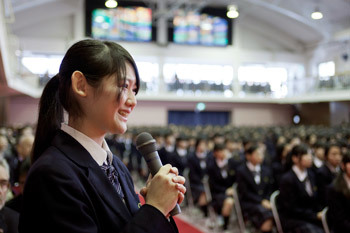 One student then stepped forward and on behalf of her fellow students thanked His Holiness for coming to the school and for his talk. She told him they appreciated his thoughtful words and would not forget them. She hoped he would enjoy the rest of his visit to Japan.