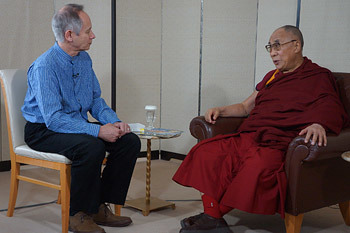 | Peter Barakan interviewing His Holiness the Dalai Lama in connection with an animated film focussing on the life of the Buddha in Tokyo, Japan on November 18, 2013. Photo/Jeremy Russell/OHHDL |