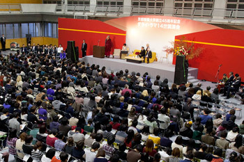 “You can do this. You can create a happier, more peaceful century. I understand that today is the 45th anniversary of the founding of this university and that from the outset there has been an emphasis on the teachers and students being on the same level. The 7 billion human beings alive today are equal in their potential. Right now, I am the speaker and you are the audience, but we are otherwise the same. If I stress that I’m a Buddhist or that I’m the Dalai Lama it creates a distance between us. To think that I’m a special or holy person would just be nonsense.”
