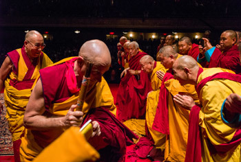 This morning, as he made his way to the Beacon Theater, where he was to speak to nearly 3000 people, a group of elderly Tibetans waited to pay their respects to him, presenting their rosaries and amulets for blessing, their eyes moist with devotion. As he walked onto the stage, His Holiness greeted many old friends amongst the Sangha gathered around the throne and saluted the audience with folded hands. Richard Gere made a brief introduction as His Holiness took his seat on the throne. He announced that first the Mangala Sutta would be recited by monks in Pali, followed by a recitation of the Heart Sutra in Sanskrit and that he would then recite laudatory verses in Tibetan that convey the essence of the Buddha’s teaching.