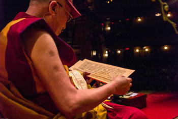 His Holiness the Dalai Lama reading from a Tibetan text during his teachings at the Beacon Theater in New York City, NY, USA on October 18, 2013. Photo/Robert Nickelsberg