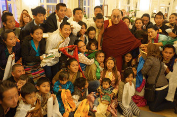 Prague, Czech Republic, 15 September 2013 - On his way through the hotel lobby as he was setting out for the venue of today’s teachings, His Holiness the Dalai Lama encountered a group of Tibetans who had come from Austria where they live to listen to his public talk yesterday. They stayed overnight and were taking the opportunity to see him again before returning home.