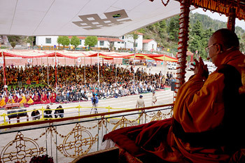 His Holiness has been invited to Dalhousie to take part in celebrations of the fiftieth anniversary of the Central School for Tibetans (CST) here and after lunch he drove to the school ground above the town. About 2000 people had gathered to listen to him teach. The about 500 Tibetans resident in Dalhousie and 240 students at the school have been joined for this occasion by 577 former students of the school who now live in 10 different countries.