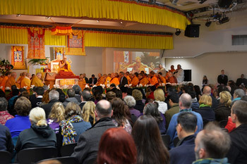 Vietnamese members of the temple had worked since early morning to produce a delicious Vietnamese vegetarian lunch. After eating, His Holiness met with a gathering of Tibetan, Mongolians, Bhutanese and Sherpas who live in the vicinity. He talked to them about their shared Buddhist culture of which they can be justly proud. He recalled the low point for Tibetans when they escaped into exile 54 years ago and how much has been achieved in terms of education and preservation of Tibetan language, culture and identity. He made a point of stressing Tibetans’ reputation for resilience, honesty and integrity, and that it is in these values that their enduring wealth lies.