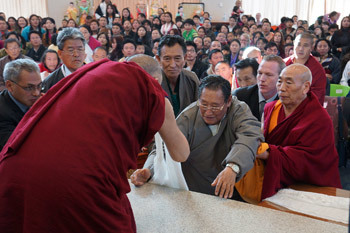 Resuming his teaching, His Holiness explained that the gist of the Perfection of Wisdom teachings to which the ‘Heart Sutra’ belongs is that things do not exist in the way they appear. He compared this to the comments made to him by American psychologist Aaron Beck that when we are overwhelmed by anger, for example, the object of our anger appears to be completely negative and yet 90% of this misconception is our own projection. He said the essence of the ‘Heart Sutra’ is: “Form is empty, but emptiness is form. Emptiness is not other than forms and forms are not other than emptiness.”