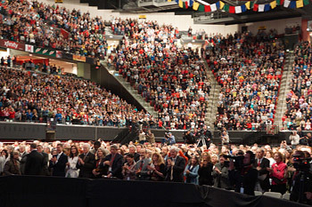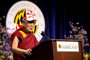 College Park, Maryland, USA, 7 May 2013 - Just before landing at Dulles Airport at the end of His Holiness the Dalai Lama’s long flight from India yesterday, the pilot warned of heavy cloud cover over the Washington area. Today, the steady rain that fell as His Holiness drove to the Comcast Center of the University of Maryland to give the annual Anwar Sadat Lecture for Peace deterred none of the audience of 15,000 from attending. They gave him a rousing welcome when he walked onto the stage escorted by University of Maryland President, Wallace Loh, Dr Elahe Omidyar Mir-Djalali, founder of the Roshan Cultural Heritage Institute and Dr Jehan Sadat, widow of the late Egyptian President and founder of the Anwar Sadat Lecture for Peace in his memory.