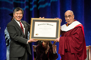 President of the University of Maryland Dr Wallace Loh presents His Holiness the Dalai Lama with an Honorary Degree of Doctor of Humane Letters at the University of Maryland in College Park, Maryland on May 7, 2013. Photo/Mike Morgan