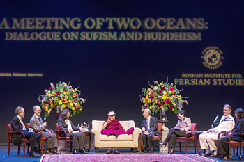 In the afternoon, at the Clarice Smith Performing Arts Center, His Holiness participated in a Meeting of Two Oceans: Dialogue on Sufism and Buddhism. After President Loh’s welcoming words, the Dean, Bonnie Thornton Dill set the scene for the meeting and thanked all who had made it possible, singling out Ven. Tenzin Dhonden for appreciation. Elahe Omidyar Mir-Djalali, founder of the Roshan Institute, spoke of her friendship with His Holiness and how in recognition of the oneness of humanity he has promoted a sense of universal responsibility. She said: