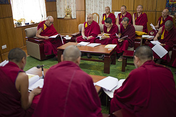 Over four days His Holiness and the group of eminent scholars from the Three Seats, engaged in lively discussions ranging from whether to include textual quotations from the Kangyur and Tengyur in the body of the text, or whether to consign them to end-notes, what emphasis to give to certain points in the presentation and the pros and cons of different technical terms. On the second and third days they were joined by Prof Samdhong Rinpoche who contributed his expert knowledge of Indian sources to the proceedings. Geshe Thutop, former abbot of Gyume Tantric College attended at His Holiness’s personal invitation, while teachers from Namgyal Monastery attended as observers.
