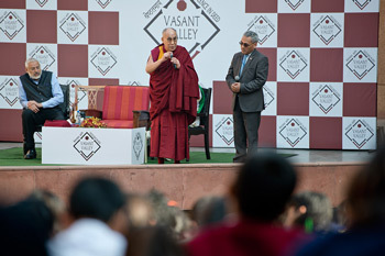 New Delhi, India, 6 December 2013 - After a tortuous drive through the Delhi traffic this morning, His Holiness the Dalai Lama visited Vasant Valley School in the south of the city. It is a school that makes a priority of academic achievement within a community of well-rounded individuals. His Holiness was met on arrival by the Director Arun Kapur and Mrs Rekha Purie, who escorted him to the stage of an amphitheatre within the grounds, where expectant students and staff awaited them. Following Mr Kapur’s brief introduction, His Holiness spoke.