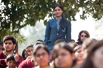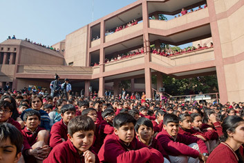 Students listening to His Holiness the Dalai Lama speaking at Vasant Valley School in New Delhi, India on December 6, 2013. Photo/Tenzin Choejor/OHHDL