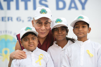 The audience applauded his words as he went on to say that in the past many patients with these ailments would simply die. Now there is hope of treatment and survival. He expressed his full support for Dr Sarin’s appeal for a widespread campaign of vaccination against hepatitis B and for provision of free treatment for patients suffering from hepatitis B and C. His Holiness also called for education to help people understand how they create their own problems through behaviour, citing the story of a Tibetan whose liver problems were a direct consequence of excessive drinking. He also suggested that if people are educated to understand that we are all part of one humanity, there will be a greater willingness to donate the organs necessary for transplants.