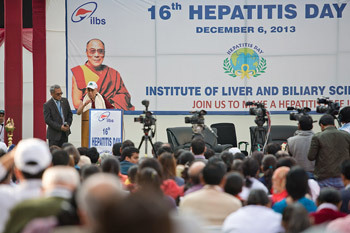 His Holiness the Dalai Lama speaking at the Institute of Liver and Biliary Science in New Delhi, India on December 6, 2013. Photo/Tenzin Choejor/OHHDL