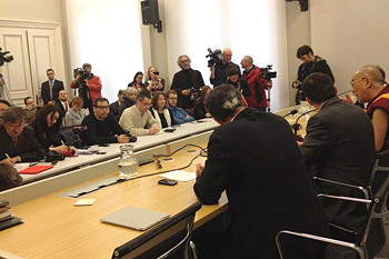 His Holiness the Dalai Lama speaking to members of the press in Trento, Italy, on April 11, 2013. Photo/Tibet Bureau Geneva