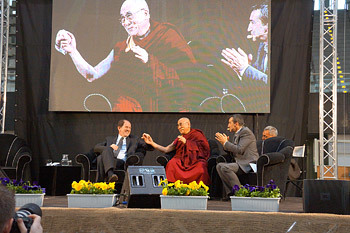 His Holiness the Dalai Lama during his talk "Happiness in a Troubled World" in Palatrento Stadium in Trento, Italy, on April 11, 2013. Photo/Jeremy Russell/OHHDL