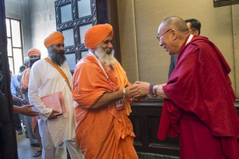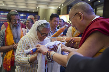 His Holiness the Dalai Lama presenting souvenirs to the delegates at the conclusion of the Inaugural Ceremony of "A Meeting of Diverse Spiritual Traditions in India" in New Delhi, India on September 20, 2014. Photo/Tenzin Choejor/OHHDL
