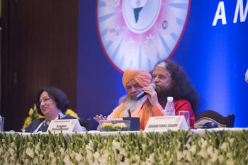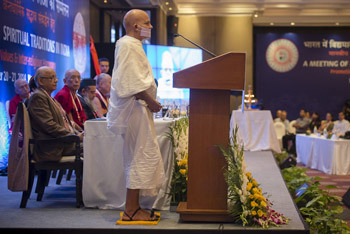 Pujya Swami Chidanand Saraswati speaking during the first plenary session of the "Meeting of Diverse Spiritual Traditions in India" in New Delhi, India on September 20, 2014.
