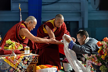 The President of the Tibetan Association of New York and New Jersey, Sonam Gyatso, offering a traditional white scarf on behalf of the Tibetan community before His Holiness the Dalai Lama's address in New York, NY, USA on November 5, 2014. Photo/Sonam Zoksang