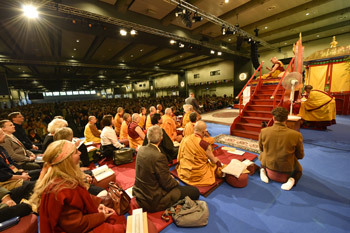 Hamburg, Germany, 26 August 2014 - The streets were quiet and the park beyond his hotel empty when His Holiness the Dalai Lama left early this morning for the teaching venue, the Congress Centre. The large hall too was virtually empty as he took his seat before the mandala pavilion on the stage to begin preparations for an Avalokiteshvara Empowerment. By the time he was ready, the audience had arrived and he greeted them from the throne: