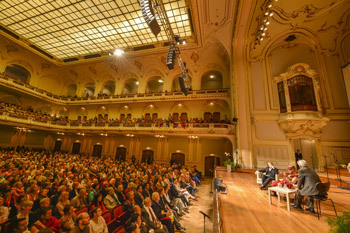 His Holiness the Dalai Lama speaking to members of the Tibetan Community in Germany and the Tibet Support Group at the Laeiszhalle in Hamburg, Germany on August 26, 2014. Photo/Manuel Bauer