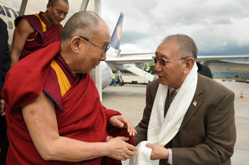 Minister-President of the German state of Hesse Volker Bouffier welcoming His Holiness the Dalai Lama outside of TibetHaus in Frankfurt, Germany on May 13, 2014. Photo/Manuel Bauer