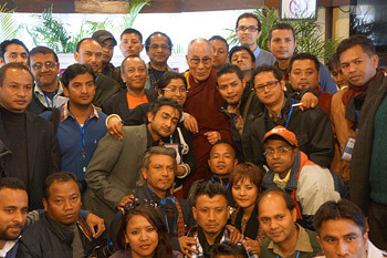 His Holiness the Dalai Lama posing with members of the press after their meeting in Shillong, Meghalaya, India on February 5, 2014. Photo/Jeremy Russell/OHHDL