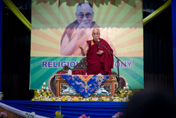 His Holiness the Dalai Lama speaking to the Tibetan community gathered at the State Central Library in Shillong, Meghalaya, India on February 5, 2014. Photo/Tenzin Choejor/OHHDL