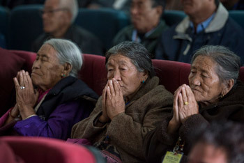 | Elderly members of the audience listening to His Holiness the Dalai Lama speaking during his meeting with the Tibetan community in Shillong, Meghalaya, India on February 5, 2014. Photo/Tenzin Choejor/OHHDL |