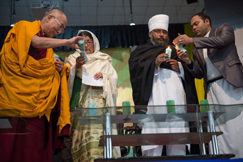 His Holiness the Dalai Lama and other representatives of spiritual traditions lighting candles at the start of an interfaith event in Shillong, Meghalaya, India on February 5, 2014. Photo/Tenzin Choejor/OHHDL