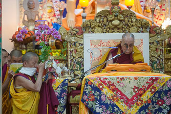 Towards the end of the session His Holiness gave the reading transmission of a prayer he has written for the swift return of Kalka Jetsun Dhampa Rinpoche. The prayer was requested by the Jonangpas and others. He again remarked that he had known the previous Jetsun Dhampa since he was ten years old. When speaking about him the other day, he mentioned that he had encouraged him to take his next birth in Mongolia.