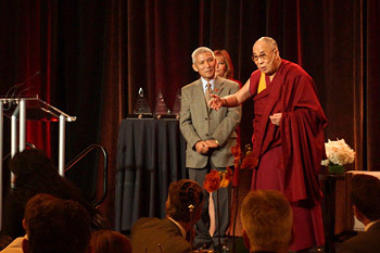 His Holiness presented awards to three men who in their vision and leadership have exemplified a humanitarian spirit that has changed lives. They were Frank Giustra, John Volken and Djavad Mowafaghian. Each expressed their acceptance modestly with Mr Mowafaghian voicing a wish to see His Holiness living freely again in Tibet.