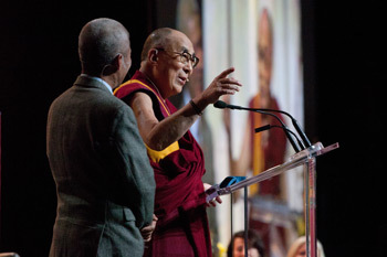 His Holiness the Dalai Lama speaking at the forum on Science of Education of the Heart at the Vancouver Convention Center in Vancouver, Canada on October 21, 2014.