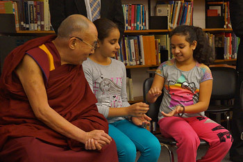 Vancouver, BC, Canada, 21 October 2104 - After a long journey to Vancouver from India via Japan, on his fourth visit to the city, His Holiness the Dalai Lama’s first public engagement today was at John Oliver School. He witnessed two classroom demonstrations.