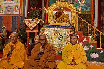 Walking onto the stage of the almost empty hall, His Holiness scrutinized the images of the Buddha, Avalokiteshvara and 21 Taras in thangkas hanging behind the throne. He joined Tsengdok Rinpoche in lighting a large butter lamp set up before them, then took his seat before the mandala pavilion and commenced the preparatory procedures. As the hall gradually filled with people, he asked them to recite Om mani padme hung.