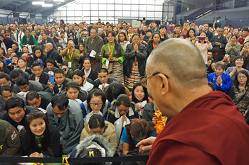 He remarked that over the previous two days he had given talks from just a human point of view, consistent with the first of his lifetime commitments to make known the means for bringing about happier individuals in a more peaceful society. The second of his commitments, as a Buddhist, is to encourage inter-religious harmony, mindful of the common purpose and message of all major religious traditions. He pointed out that India is a living example that it is possible for a variety of religious traditions to live together, side by side, in respect and harmony. Since conflict in the name of religion is not confined to the past, but is rearing its head again today, this is significant.