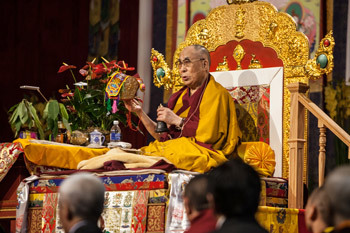 “Once the teaching of the Buddha reached Tibet, our culture became imbued with peace and non-violence. The proper way to pursue Buddhist teachings is not just to rely on faith, but to study. This reflects the tradition of Nalanda University that is at the core of the Tibetan Buddhist tradition. This morning I’m going explain a short text, the ‘Eight Verses for Training the Mind’ and in the afternoon I’ll be giving an Avalokiteshvara empowerment.”