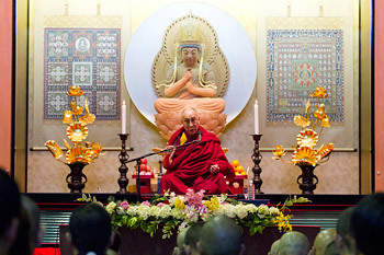 In the packed hall, His Holiness took his seat on the stage, seated before a statue of Mahavairochana flanked by two sets of his mandalas and began his talk.