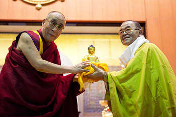 His Holiness the Dalai Lama presenting a Buddha statue to Ven. Suguri Kouzui, Dean of the University, after his talk at Shuchi-in University in Kyoto, Japan on April 10, 2014. Photo/Office of Tibet, Japan