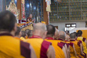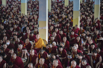 Mundgod, Karnataka, India, 27 December 2014 - Thousands of monks, nuns and lay-people seated in the basement, in the temple, on its verandas and under the canopy over the courtyard were ready to listen to His Holiness the Dalai Lama when he arrived from Ganden Shartse a little early this morning.
