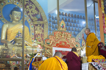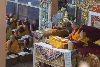 His Holiness the Dalai Lama joining in prayers at the conclusion of the fifth day of his teachings at Ganden Jangtse Monastery in Mundgod, Karnataka, India on December 27, 2014.